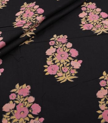 Pre-Cut 1m Black Floral Handblock Printed 100% Pure Soft Cotton Fabric