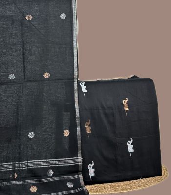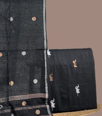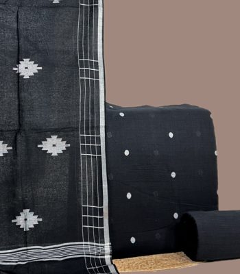 Black – 3Pc Handloom Cotton Dupatta with Woven Motif Top & Handloom Soft Cotton Bottom Fabric Set