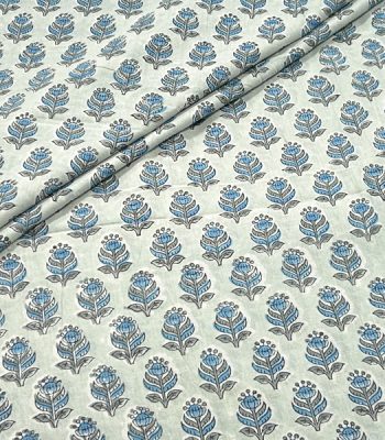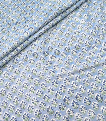 Pastel Blue Floral Handblock Printed 100% Pure Soft Cotton Fabric