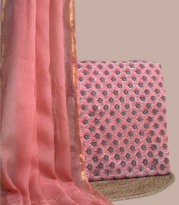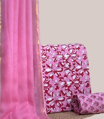 Pink – 3pc Kota Doria Dupatta with Blockprint Pure Soft Cotton Top & Bottom Set