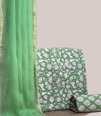 Green – 3pc Kota Doria Dupatta with Blockprint Pure Soft Cotton Top & Bottom Set