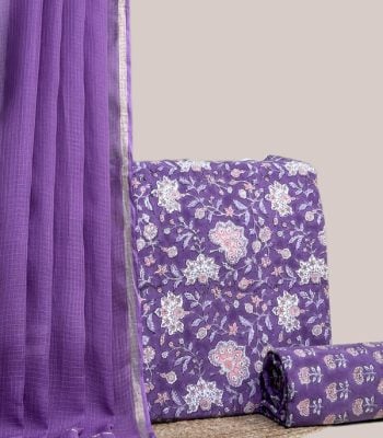 Purple – 3pc Kota Doria Dupatta with Blockprint Pure Soft Cotton Top & Bottom Set