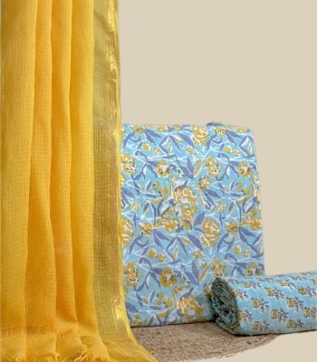 Blue – 3pc Kota Doria Dupatta with Blockprint Soft Cotton Top & Bottom Set
