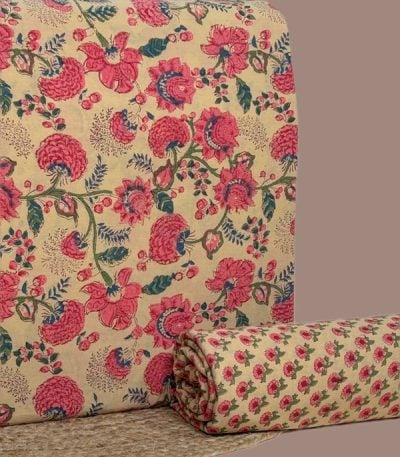 Beige Floral Handblock Printed 100% Pure Soft Cotton Fabric