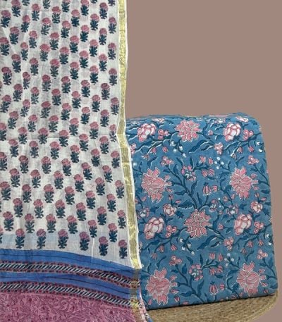 Blue – 2pc Blockprinted Cotton Dupatta and Pure Soft Cotton Top Fabric Set