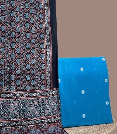 Blue – 2pc Ajrakh HandCrafted Cotton Dupatta and Woven Design Handloom Top Cotton Fabric Set