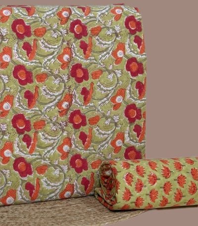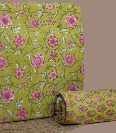 Avocado Green Floral Handblock Printed 100% Pure Soft Cotton Fabric