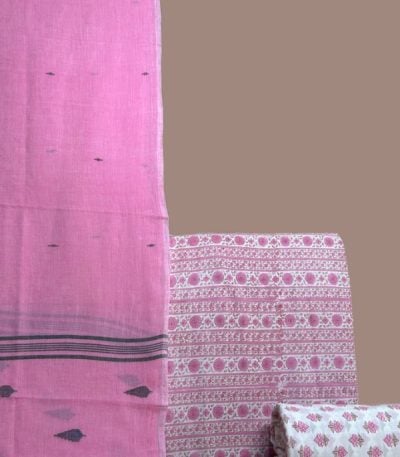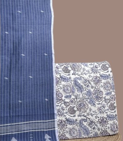 White – 3pc Handloom Soft Cotton Dupatta with Blockprint Cotton Top & Bottom Set