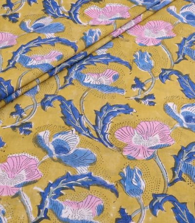 Golden Yellow Floral Handblock Printed 100% Pure Soft Cotton Fabric