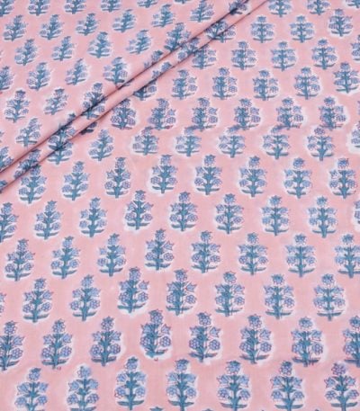 Pastel Pink Floral Handblock Printed 100% Pure Soft Cotton Fabric
