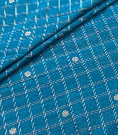 Sea Blue Checkered Woven Design Flowy HandLoom Pure Soft Cotton Fabric