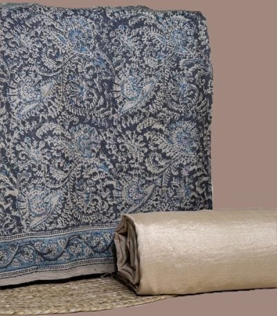 Black – 2pc (2.8mtr Top) Tussar Silk Blockprinted Top with Pure Silk Bottom Fabric Set