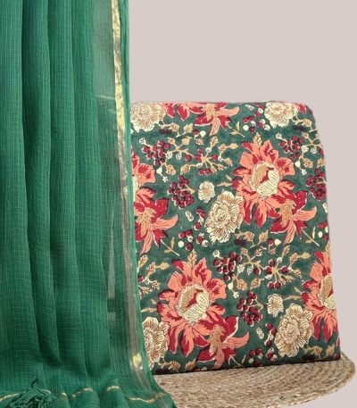 Green – 2pc Kota Doria Dupatta and Pure Soft Cotton Blockprint Top Fabric Set