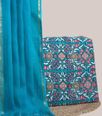 Blue – 2pc Kota Doria Dupatta and Pure Soft Cotton Blockprint Top Fabric Set