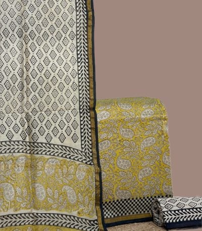Yellow – 3pc Chanderi Silk Dupatta and Top Fabric with Cotton Blockprint Bottom Fabric Set