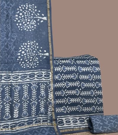 Blue – 3pc Chanderi Silk Dupatta and Top Fabric with Cotton Blockprint Bottom Fabric Set