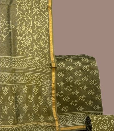 Green – 3pc Chanderi Silk Dupatta and Top Fabric with Cotton Blockprint Bottom Fabric Set