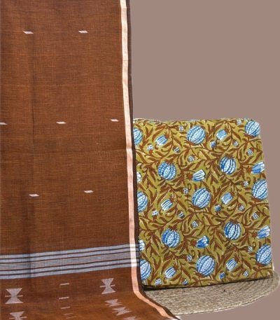 Brown – 2pc Handloom Cotton Dupatta and Blockprinted Soft Cotton Top Set