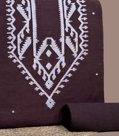 Brown – 2Pc Handloom Woven Neck Design Soft Cotton Top(3m) Bottom(2.5m) Fabric Set