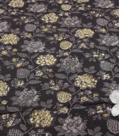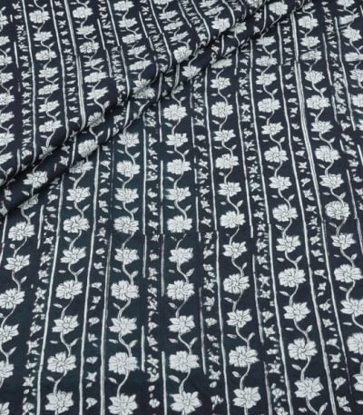 Black Floral Handblock Printed 100% Pure Soft Cotton Fabric