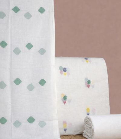 White – 3Pc Handloom Cotton Dupatta with Woven Motif Top & Handloom Soft Cotton Bottom Fabric Set