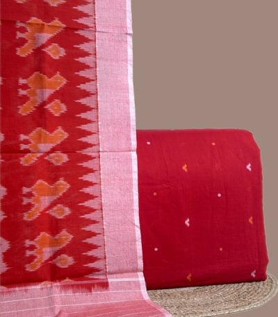 Red – 2pc Ikkat Cotton Dupatta and Handloom Woven Motif Cotton Top Fabric Set