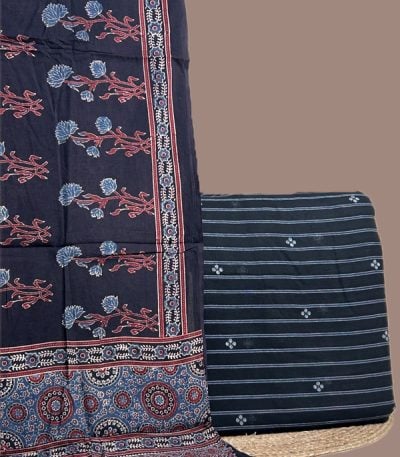 Black – 2pc Ajrakh HandCrafted Cotton Dupatta and Woven Design Handloom Top Cotton Fabric Set