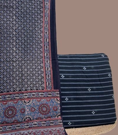 Black – 2pc Ajrakh HandCrafted Cotton Dupatta and Woven Design Handloom Top Cotton Fabric Set