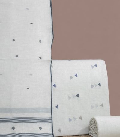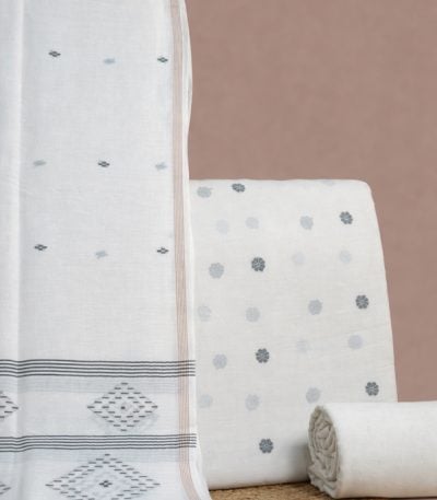 White – 3Pc Handloom Cotton Dupatta with Woven Motif Top & Handloom Soft Cotton Bottom Fabric Set
