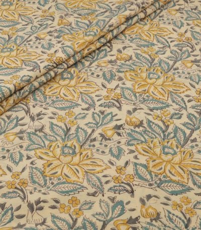 Champagne Yellow Floral Handblock Printed 100% Pure Soft Cotton Fabric