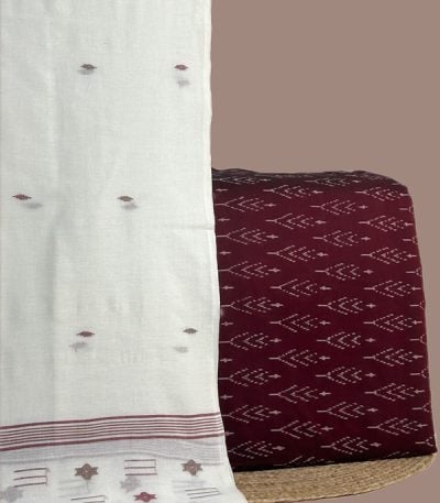 White – 3Pc Handloom Cotton Dupatta with Woven Motif Top & Handloom Soft Cotton Bottom Fabric Set