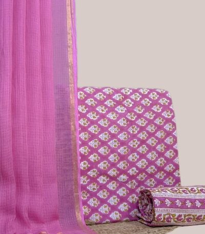 Pink – 3pc Kota Doria Dupatta with Blockprint Soft Cotton Top & Bottom Set