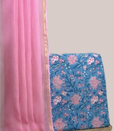 Blue – 2pc Kota Doria Dupatta and Pure Soft Cotton Blockprint Top Fabric Set