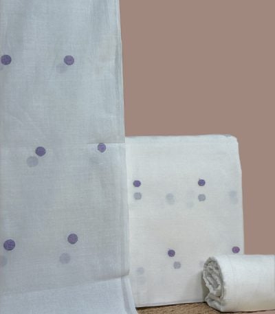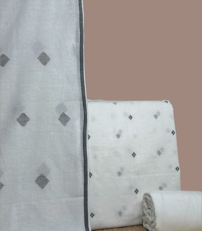 White – 3Pc (3mtr Top) Handloom Cotton Dupatta with Woven Motif Top & Handloom Soft Cotton Bottom Fabric Set