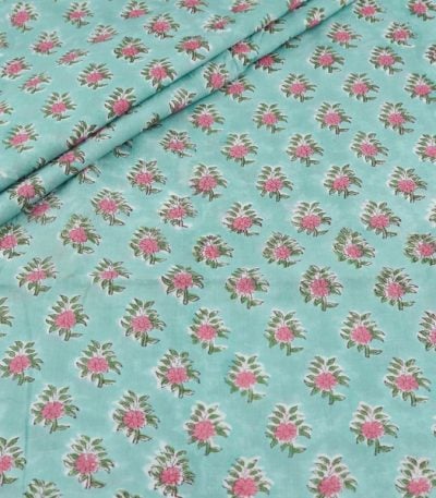 Pastel Blue Floral Handblock Printed 100% Pure Soft Cotton Fabric