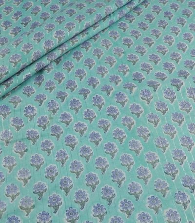 Turquoise Self-Zari Stripes Floral Handblock Printed 100% Pure Soft Cotton Fabric