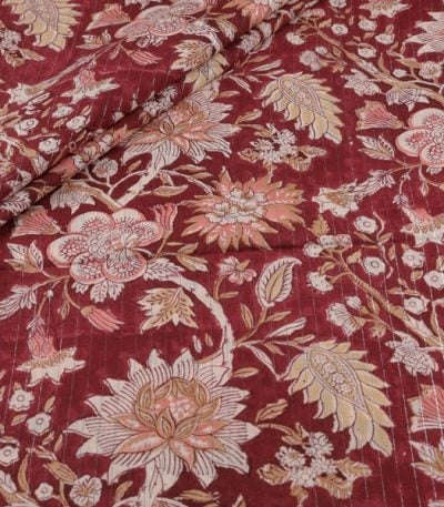Maroon Red Self-Zari Stripes Floral Handblock Printed 100% Pure Soft Cotton Fabric