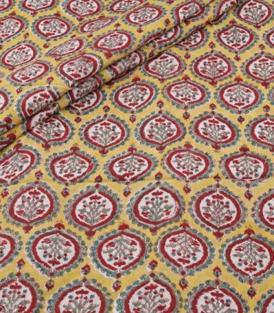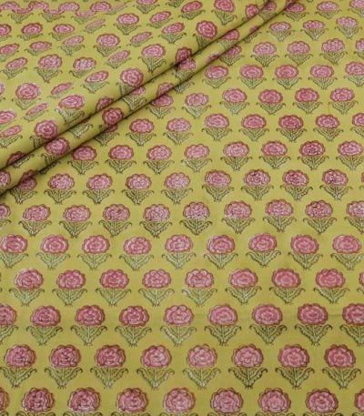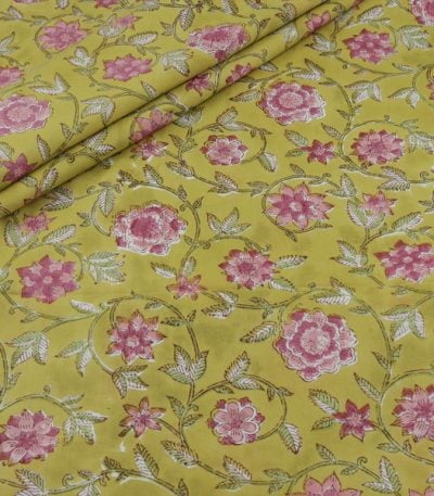 Yellow Floral Handblock Printed 100% Pure Soft Cotton Fabric