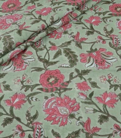 Moss Green Floral Handblock Printed 100% Pure Soft Cotton Fabric