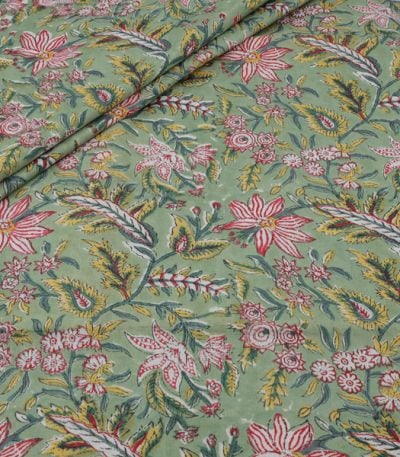Celadon Green Floral Handblock Printed 100% Pure Soft Cotton Fabric