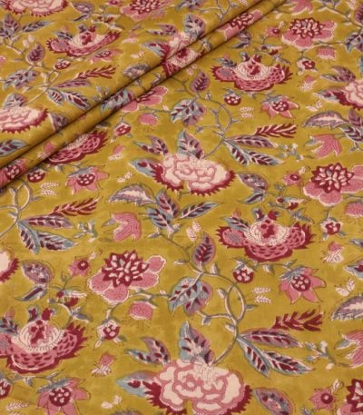 Dark Goldenrod Yellow Floral Handblock Printed 100% Pure Soft Cotton Fabric