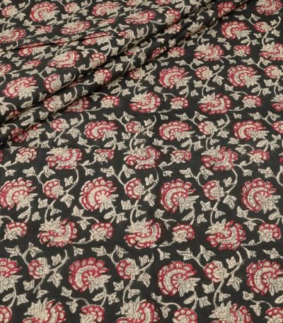 Black Floral Handblock Printed 100% Pure Soft Cotton Fabric