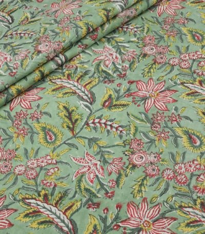 Celadon Green Floral Handblock Printed 100% Pure Soft Cotton Fabric