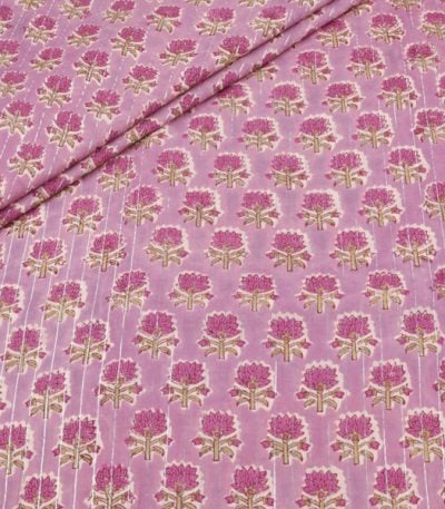 Pink Self-Zari Stripes Floral Handblock Printed 100% Pure Soft Cotton Fabric