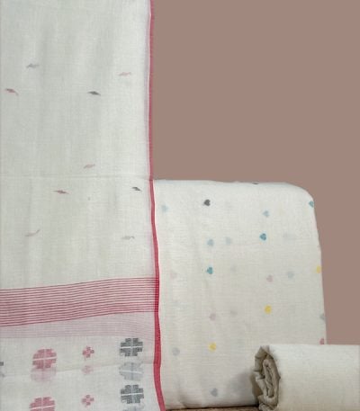 White – 3pc Handloom Soft Cotton Dupatta with Blockprint Cotton Top & Handloom Cotton Bottom Set