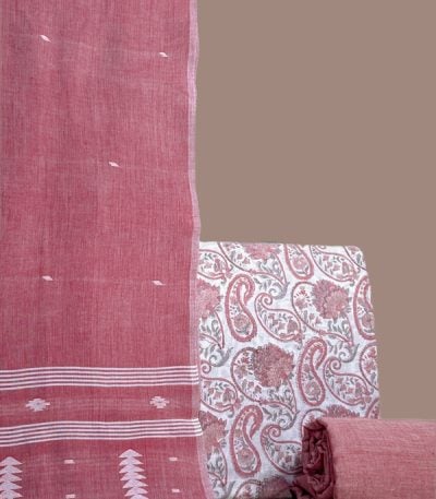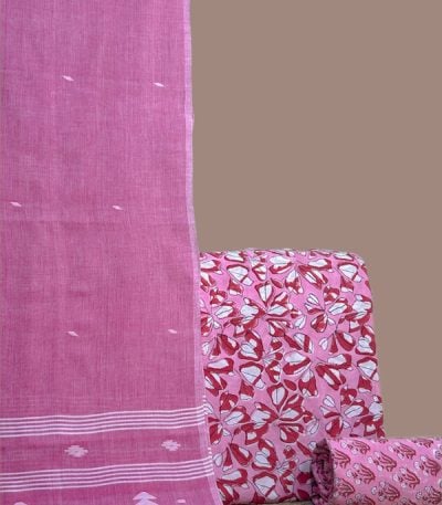 Pink – 3pc Handloom Soft Cotton Dupatta with Blockprint Cotton Top & Bottom Set