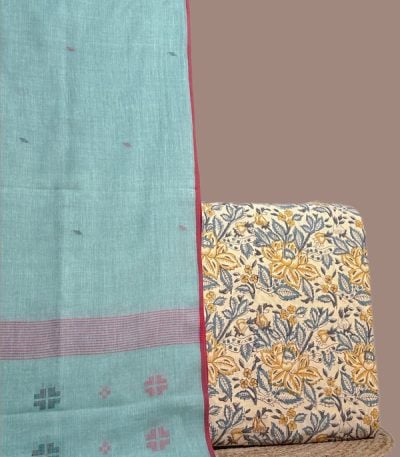 Blue – 3pc Handloom Soft Cotton Dupatta with Blockprint Cotton Top & Handloom Cotton Bottom Set
