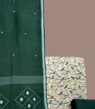 Green – 3pc Kota Doria Dupatta with Blockprint Soft Cotton Top & Bottom Set