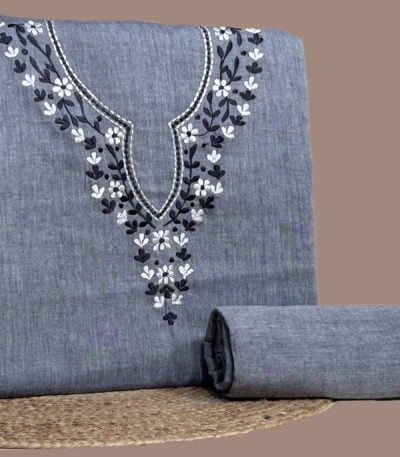 Gray – 2Pc Handloom Embroidered Neck Design Soft Cotton Top(3m) Bottom(2.5m) Fabric Set