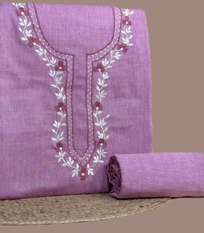 Purple – 2Pc Handloom Embroidered Neck Design Soft Cotton Top(3m) Bottom(2.5m) Fabric Set